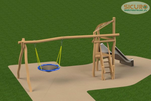 Het driehoekplateau combi met dak is een speelhuisje voorzien van glijbaan en een vogelnestschommel, met een plateauhoogte van 120cm. Een erg leuk combinatietoestel voor voorbeeld schoolpleinen en in de openbare ruimte, wat geschikt is voor gebruik door meerdere kinderen tegelijk, maar ook kinderen die minder goed te been zijn. Dit doordat dit toestel zowel met normale als brede glijbaan leverbaar is.