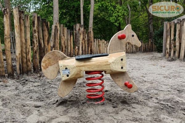 Robinia veerelement uitgevoerd als een paard. Een klassiek speeltoestel met natuurlijke uitstraling, blijvend leuk voor de allerkleinste en geschikt voor praktisch alle speelplekken. Door op en neer te veren wordt het kind sensorisch geprikkelt, een spelelement wat vooral voor de allerkleinste of kinderderen met een ontwikkelingsachterstand erg leuk is. Het paarden thema prikkelt daarnaast ook de fantasie.